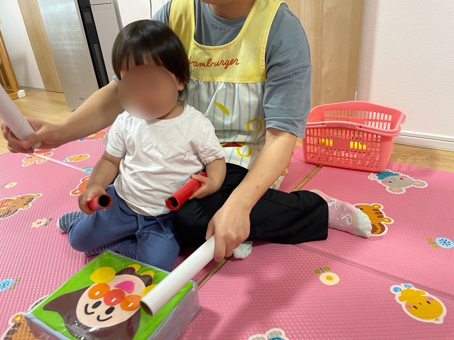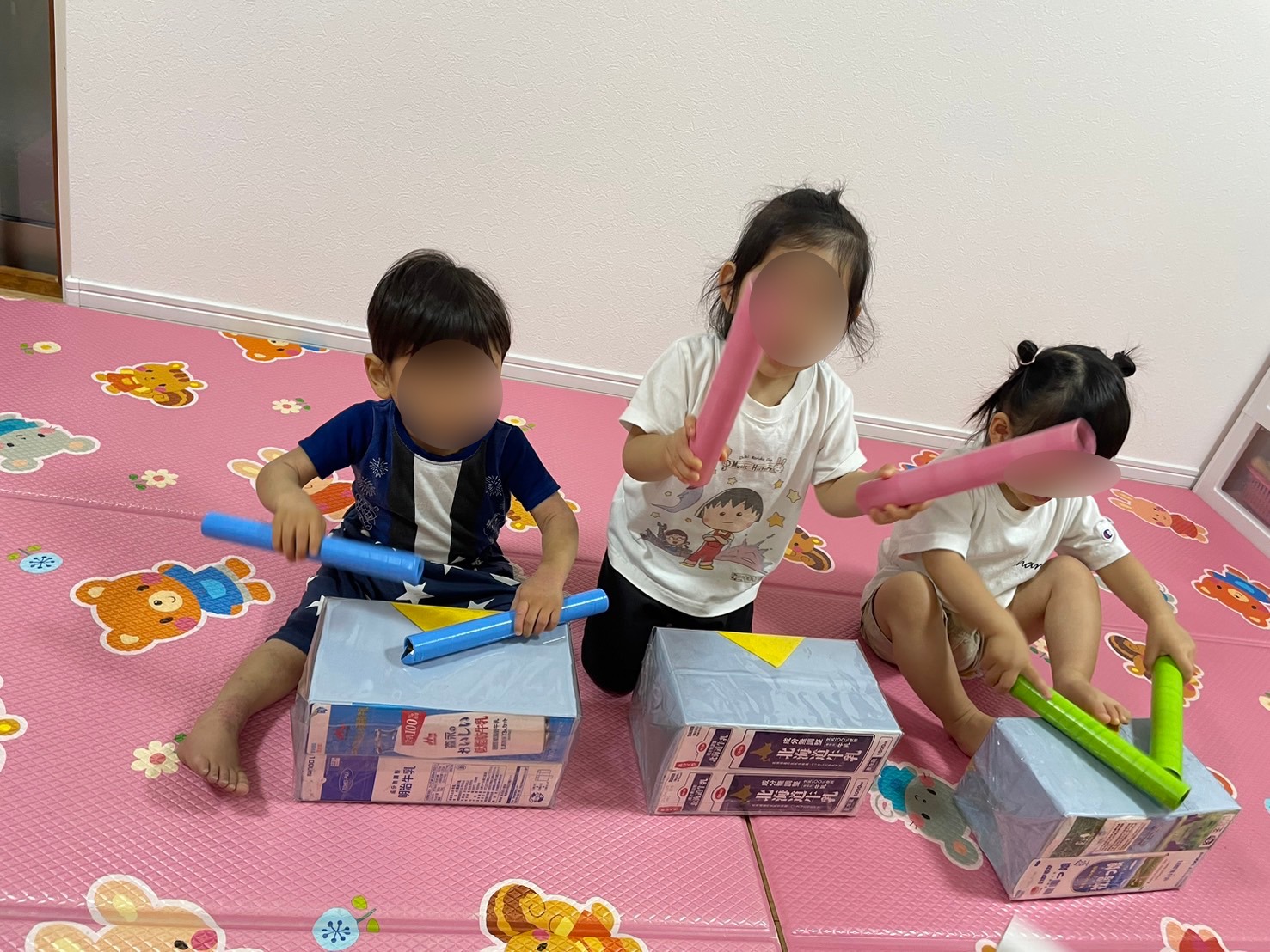 牛乳パックを太鼓にしてリズムあそびを楽しみました。