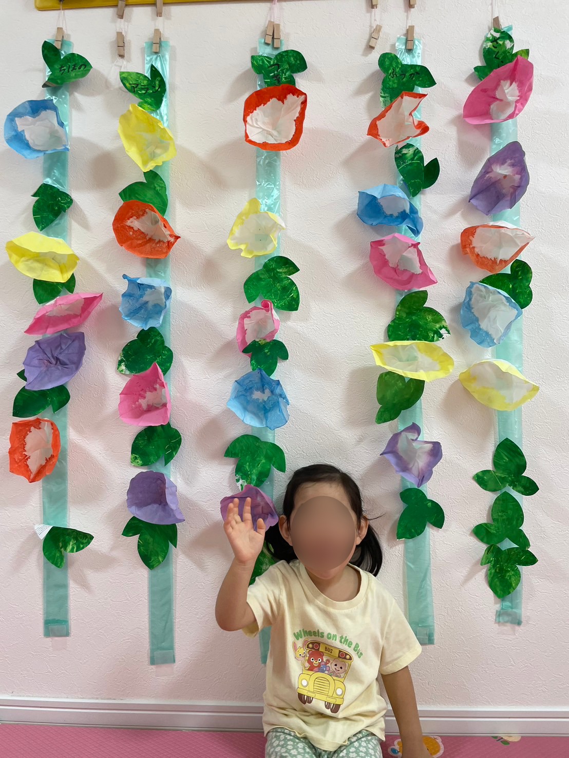 紙で作った朝顔の花をいっしょうけんめいにはりつけています。