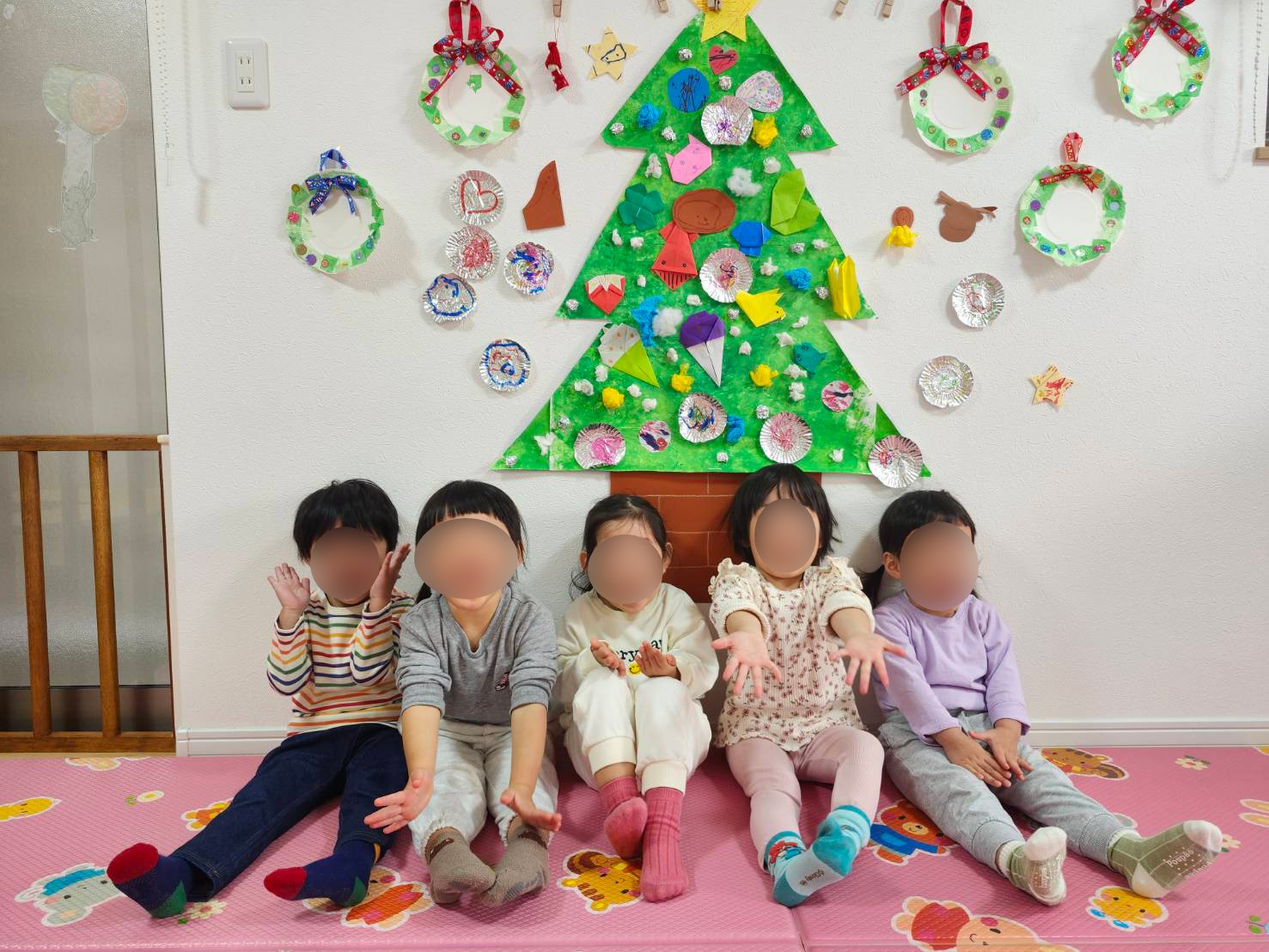 みんなで作ったクリスマスツリーの下で記念写真を撮りました。